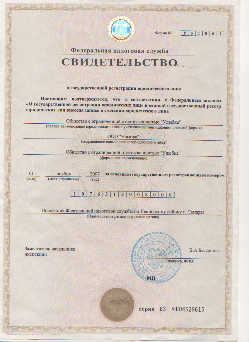Полное наименование: Общество с ограниченной ответственностью «Улыбка»