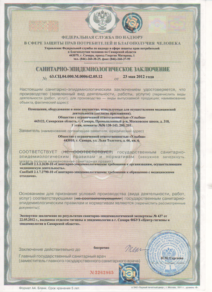 Лицензия на осуществление медицинской деятельности, выдана Министерством здравоохранения Самарской области (сканы лицензии — см. ниже на этой странице)